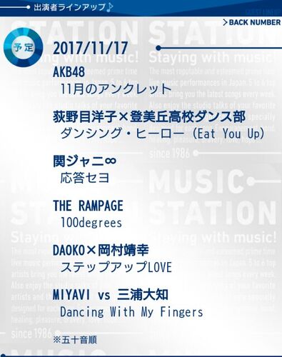 11/17(金)。。。ミュージックステーション。。。 神 回。。。神 回 確 定 だ。。。 岡村靖幸と三浦大知とMIYAVIを同時に見られるのは恐らく今宵が最初で最後。。。 日本最高峰のパフォーマンスの門は開かれている。。。 …。 こんばんは、例のコピペを弄ろう…